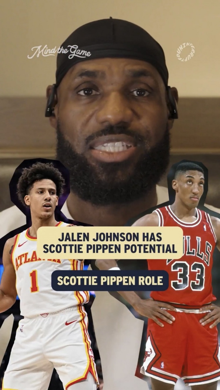 谈到老鹰前锋杰伦·约翰逊的前景,詹姆斯说:“我提到了皮蓬,当然,他还有很大差距。但是他的天赋就在那里,像他这样拥有一双长臂,身高6尺9、6尺10,跑起来像鹿一般,运动能力十足,他也改善了他的外线投篮,不过,他的冲筐能力,篮板能力,他能从一号位防到五号位,大部分的一号位和五号位他都能防,有些五号位防起来更有挑战性,比如恩比德、约基奇这种,他们打任何人都是错位。还有他的组织能力。我喜欢他的上限前景,我不知道具体的天花板在哪,但我知道高度很高,我很期待看到将来会怎样。我认为他毫无疑问将会成为本赛季的东部全明星球员。”